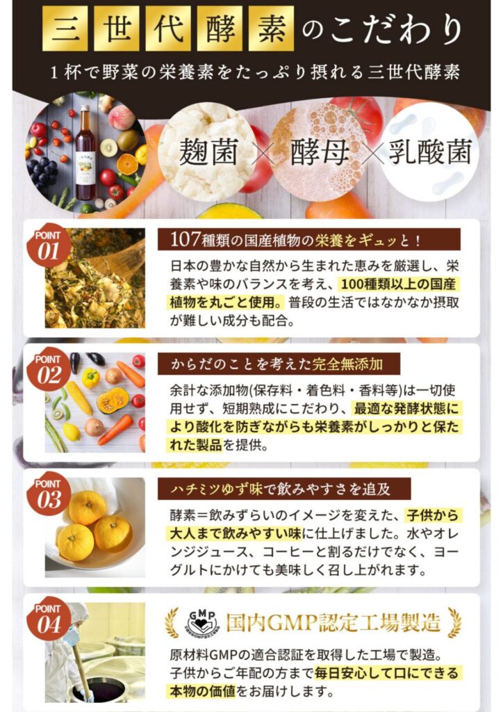 これらの習慣に加えて、善玉菌の成長を促進する栄養豊富な食品を摂取することも効果的です。しかし、現代の忙しい生活の中で、毎日バランスの取れた食事を摂ることは容易ではありません。そこで皆様の健康的な生活をサポートするための「三世代酵素」を開発しました。この製品は、107種類の厳選された国産植物原料を水や添加物を一切加えずに発酵させたエキスです。「三世代酵素」の特徴: